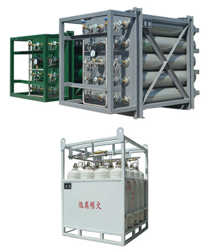 气瓶集装格(又称气体集装格),是用来将散装气瓶集束在一起集中充装和供气的气源结构。具有结构紧凑、设计合理、强度可靠、方便运输等特点,适合集中供气及大规模用气单位使用。构架配有叉装口及吊环,方便实现装置在充装地点与使用地点之间的运输。装置配套汇流管结构合理、设计可靠,便于气体充装与使用。产品根据充装介质的不同及用户的实际使用压力可做成立式和卧式两种。根据不同的气体介质工作压力最高可达到20MPa。气瓶集装格一般按用户要求可以高压输出,也可经过减压器减压输出。该装置使用方便安全可靠,工作效益高,目前在国内外市场广泛使用。